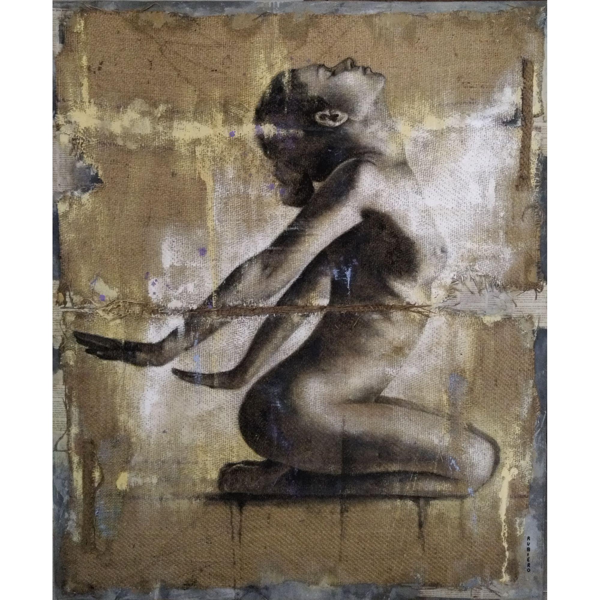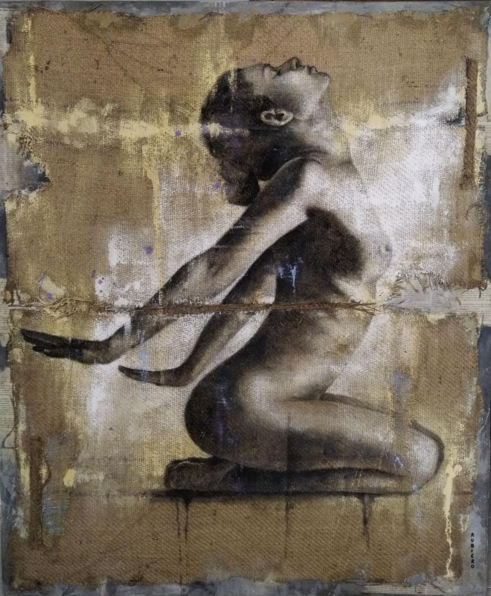 tecnica mista, tela di juta su cardboard (cartone), 2025